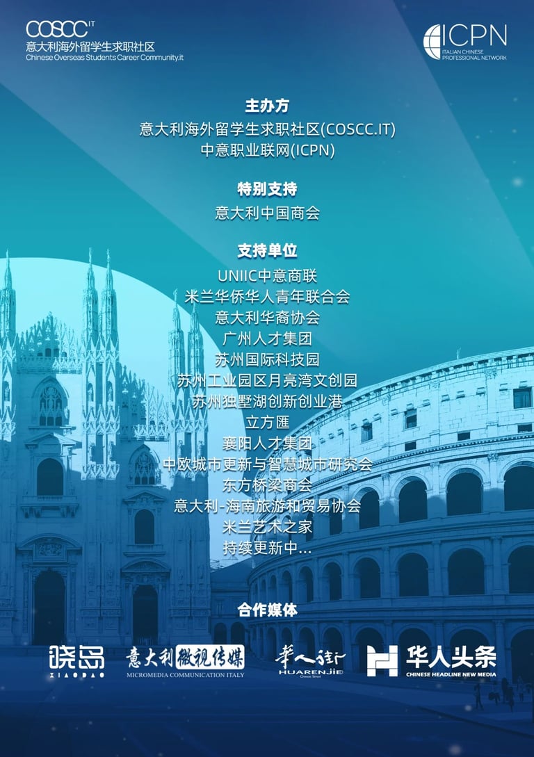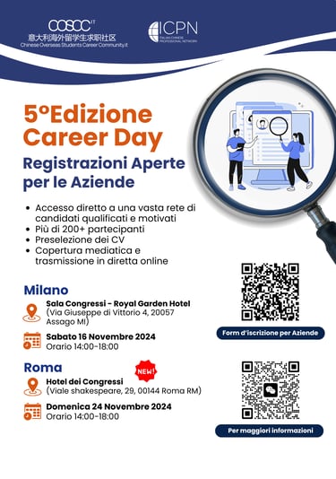 La 5^ Edizione del Career Day è co-organizzata da ICPN - Italian Chinese Professional Network, e COSCC - Chinese Overseas Students Career Community, che riunisce talenti di seconda e terza generazione provenienti da diversi settori professionali. Questa fiera continuerà a utilizzare un formato ibrido, combinando l' evento in presenza e trasmissione in diretta online, per offrire un'ampia piattaforma di comunicazione tra candidati e aziende reclutatrici.