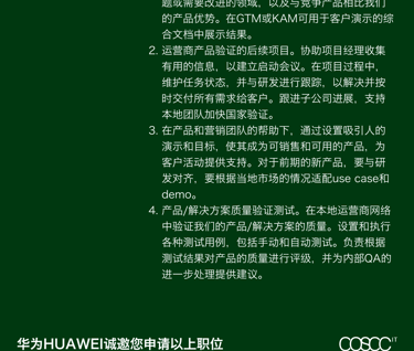 在产品和营销团队的帮助下,通过设置吸引人的演示和目标,使其成为可销售和可用的产品,为客户活动提供支持。对于前期的新产品,要与研发对齐,要根据当地市场的情况适配use case和demo。